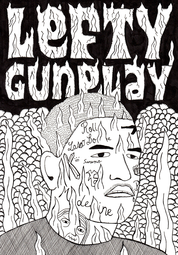 Dans leur Los Angeles, l’appartenance se lit dans les corps, dans les gestes, dans la manière de prononcer certains noms ou d’en éviter d’autres. Les gangs y persistent comme un ordre ancien, souvent plus structurant que celui censé maintenir la paix. Ils dessinent une cartographie que Lefty laisse affleurer sur sa peau. Ses tatouages racontent ses affiliations, ses croyances, ses incarcérations. L’un rend hommage à Drakeo justement, un autre évoque ses origines guatémaltèques et la culture maya. Sa trajectoire se fraie un chemin dans cet entrelacs, rappelant que le rap naît rarement de récits propres ou d’arcs narratifs parfaits, mais plutôt dans les zones de friction. Cette trajectoire n’est pas secondaire à son art : elle en constitue le tissu même. Loin des abstractions, des grandes mises en scène ou des envolées détachées du monde, son rap ne se met jamais à distance de l’expérience qu’il décrit, et n’essaie pas de discipliner son chaos. Sur ses premières mixtapes, Lefty Gunplay appartient à ces feux que l’on n’a pas su accompagner ni canaliser. Ses qualités, d’imprévisibilité, de charisme, d’envie de prouver, insufflent une énergie abrasive à sa musique, mais sont aussi à la source de plein de défauts, d’instabilité, de constructions bancales, d’images au goût douteux.
